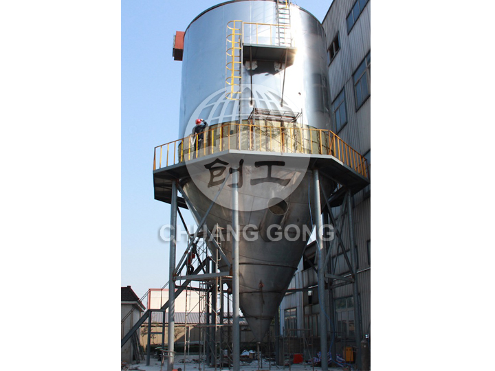 空氣經過濾和加熱,進入干燥器頂部空氣分配器,熱空氣呈螺旋狀均勻地進入干燥室。料液經塔體頂部的高速離心霧化器,(旋轉)噴霧成極細微的霧狀液珠,與熱空氣并流接觸在極短的時間內可干燥為成品。成品連續地由干燥塔底部和旋風分離器中輸出,廢氣由風機排空。